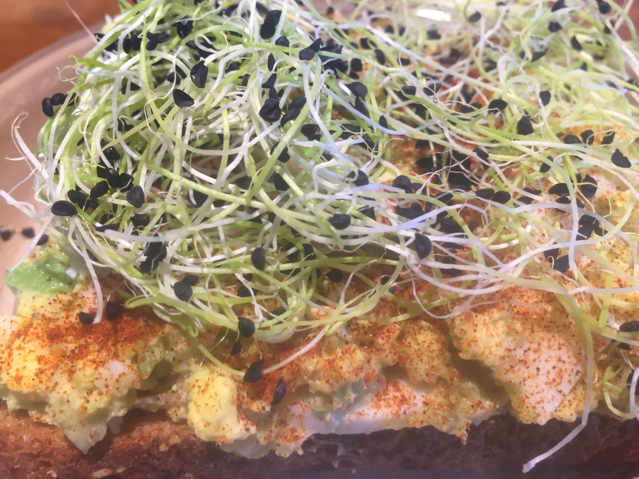 Faire cuire les oeufs en les déposant dans un chaudron d’eau froide. Porter à ébullition et compter 10 minutes lorsque ça commence à bouillir. On peut faire cette étape d’avance et garder les oeufs au frigo. Couper l’avocat en petits morceaux et le mettre dans un bol. Ajouter le jus d’un quartier de citron ou de lime, ajouter du sel et du poivre au goût. Écraser à la fourchette. Faire griller votre tranche de pain. Couper les oeufs en petits morceaux, ajouter à l’avocat et écraser et mélanger à la fourchette. J’aime bien que les morceaux restent gros. Étendre le mélange oeufs-avocat sur la tranche de pain grillée, saupoudrer de paprika. Mettre la poignée de luzerne sur le dessus. Couper en deux, servir. Sandwich ouvert aux oeufs et à l'avocat On peut le manger seul en collation ou le servir avec des légumes ou une salade pour un repas complet. 1 rouge – 1 jaune – 1 bleu