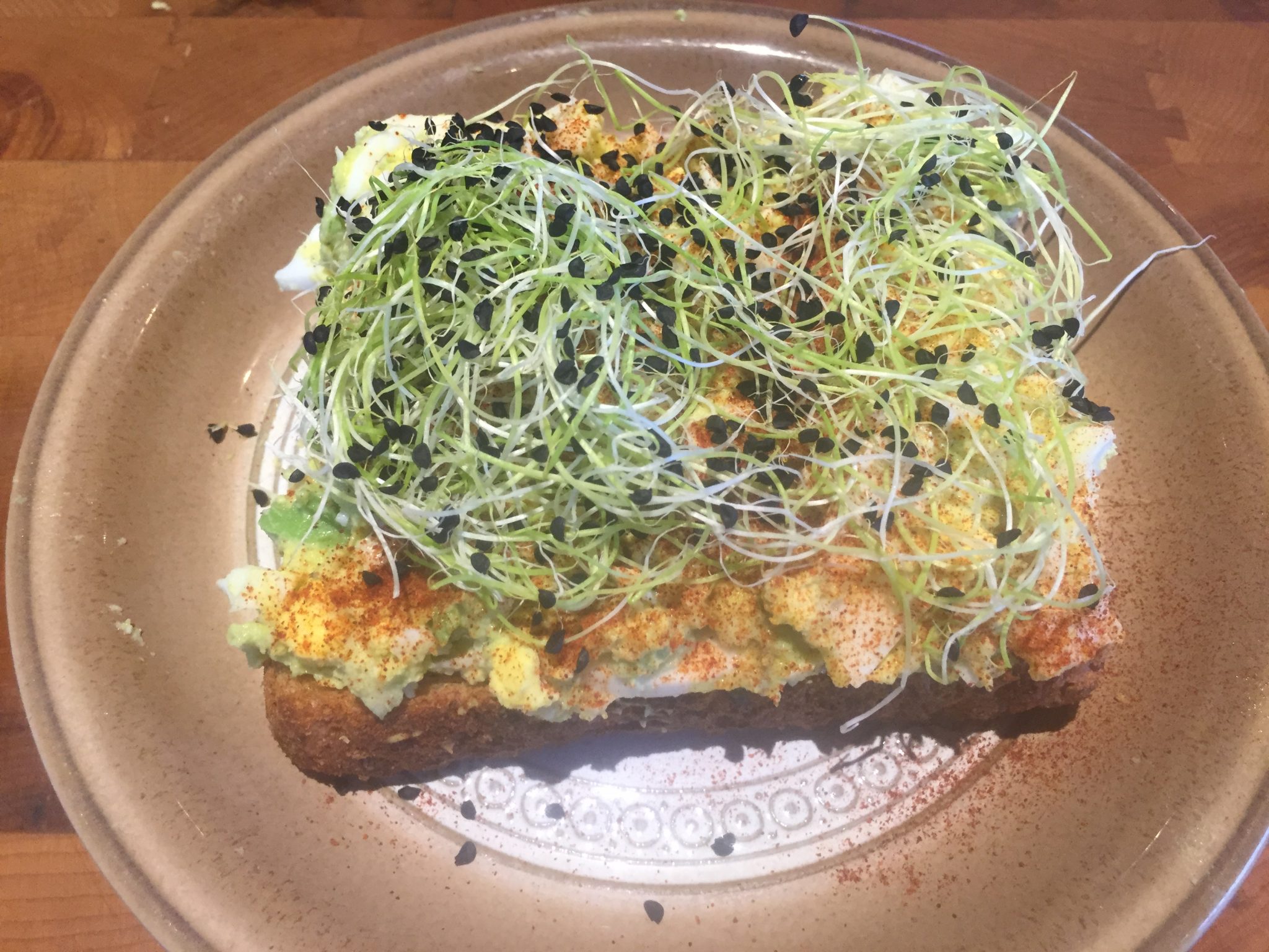 Sandwich ouvert aux oeufs et à l'avocat Lorsque c’est l’heure du lunch et que je suis occupée, je veux quelque chose de facile et rapide! Ce sandwich ouvert aux oeufs et à l’avocat est simple, bon et nutritif! Je n’en demande pas mieux. Les oeufs et l’avocat se prépare d’avance et on peut l’apporter comme lunch avec un tranche de pain de blé entier.   Sandwich ouvert aux oeufs et à l'avocat